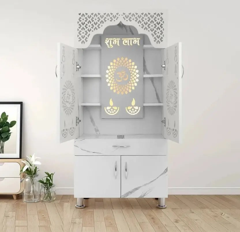 Gorgeous White Wooden Temple with OM LED Back Panel & Spacious Drawers Storage Cabinet for Home & Office