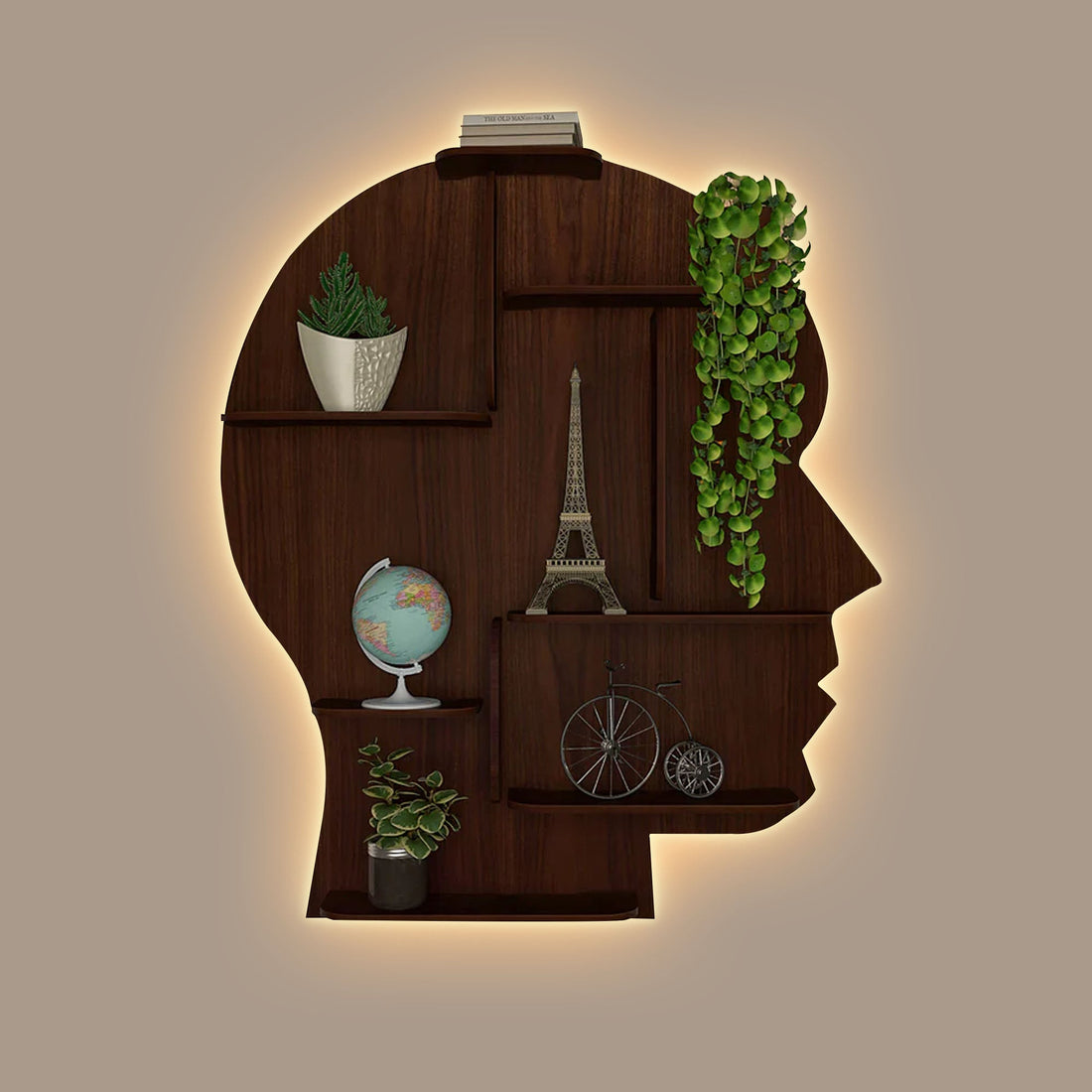 Man Backlit Designer Wooden Wall Shelf / Book Shelf, Walnut Finish