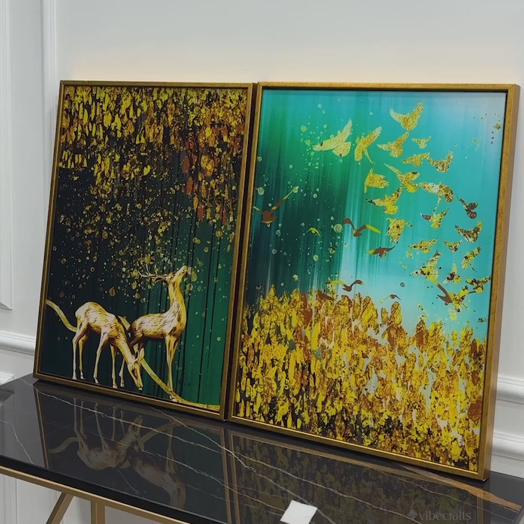 Beautiful Golden Birds and Deer Acrylic Floating Wall Painting Set Of 2
