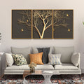 Golden Embossed Tree with Golden Birds Premium Floating Canvas Wall Painting Set of Three