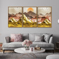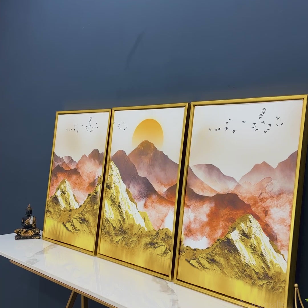 Golden Mountains and Birds Scenery Floating Canvas Wall Painting Set of Three
