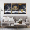 Midnight Golden Deer With Birds Scenery Premium Floating Canvas Wall Painting Set of Three